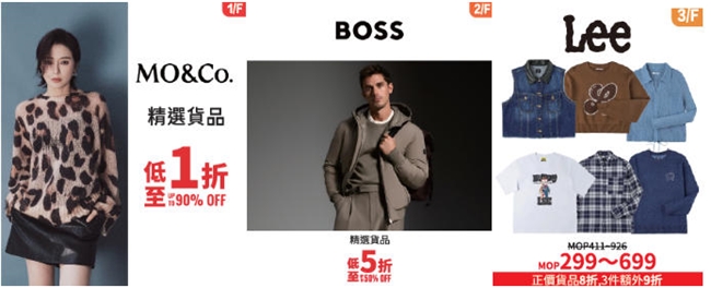 购物选择再升级!“摩安珂”、“BOSS”、“Lee”等一众男女时尚潮牌纷纷推出特选商品,最低折扣可达一折。更有超值秋冬装,两百多澳门元就能带走,为您的衣橱焕新提供了极具吸引力的选择。
