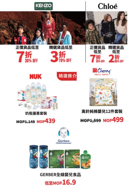 育儿购物清单一次清空!一众母婴产品、童装、玩具及文具精品价格低至16.9澳门元。其中,包括“KENZO”、“蔻依”在内的多家欧洲高端童装品牌也深度参与,折扣力度低至二折!让家长在优惠期间能为孩子置办兼具品质与风尚的全年装备。